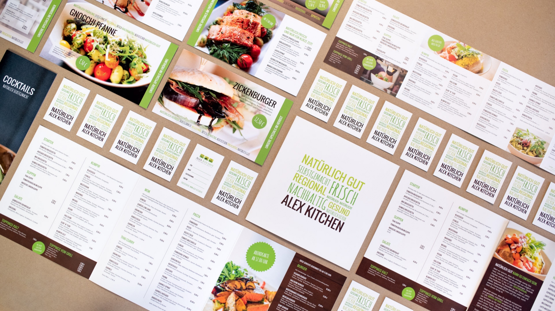 Ein neues und junges Restaurant-Konzept für Husum und Heide. Frische und gesunde Gerichte, kreative Rezepte, viel Luft und Licht sowie Live-Cooking waren die Zutaten für Alex Kitchen. Daraus sollten wir ein Konzept für den visuellen Auftritt entwickeln, das Alex Kitchen in kurzer Zeit im wahrsten Sinn des Wortes in aller Munde bringt.
